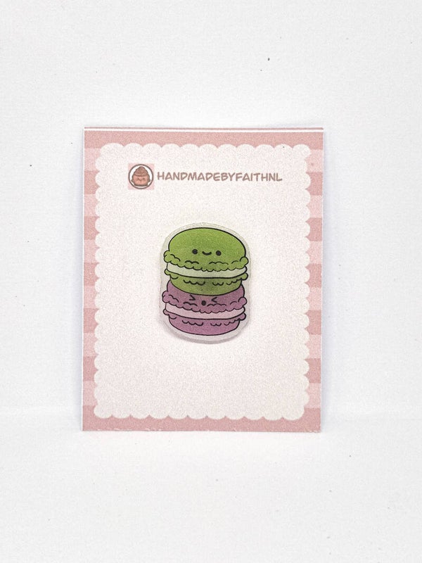 Twee kleurrijke macarons op elkaar gestapeld met een lief gezichtje. Met de hand ontworpen en gemaakt van shrink plastic, dus altijd een uniek exemplaar. Perfect voor iedereen die houdt van zoete, schattige details!