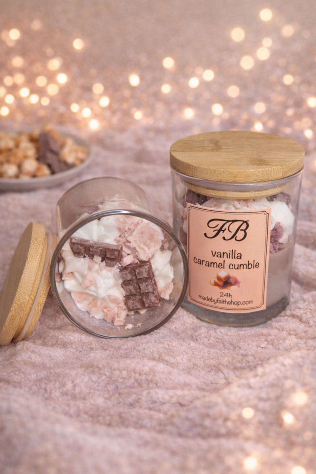 Gemaakt van 100% natuurlijke sojawas, is hij afgewerkt met een luchtige “whipped” waxlaag en gedecoreerd met een crumble en stukjes chocolade met karamel – puur voor het oog, niet om te eten.