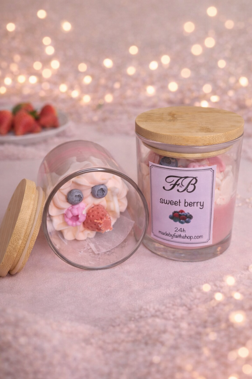 Gemaakt van 100% natuurlijke sojawas, is hij afgewerkt met een luchtige “whipped” waxlaag en gedecoreerd met een verschillende bosvruchtjes – puur voor het oog, niet om te eten.