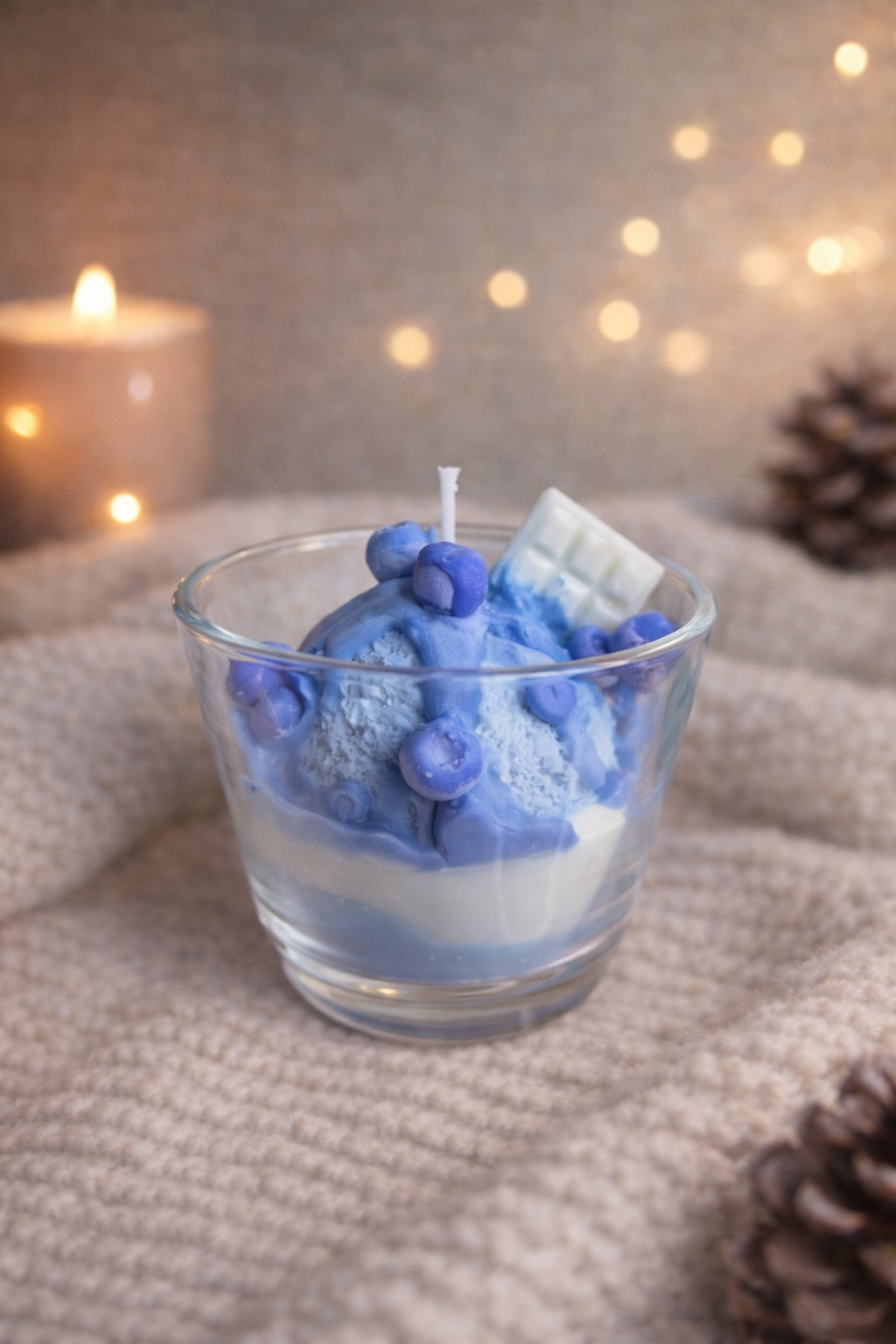 Deze handgemaakte decoratieve kaars is gegoten in een glazen dessertglas en vormgegeven als een heerlijk toetje. De kaars bevat een bolletje “ijs” afgewerkt met bosbes, wat zorgt voor een speelse en luxe uitstraling. Een echte eyecatcher voor je interieur.