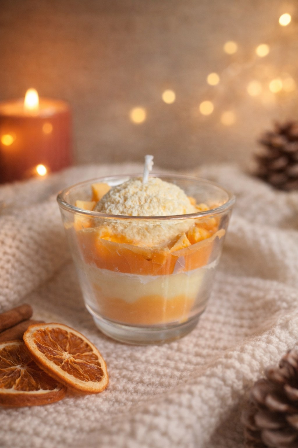 Deze handgemaakte decoratieve kaars is gegoten in een glazen dessertglas en vormgegeven als een heerlijk toetje. De kaars bevat een bolletje “ijs” afgewerkt met mangostukjes, wat zorgt voor een speelse en luxe uitstraling. Een echte eyecatcher voor je interieur.