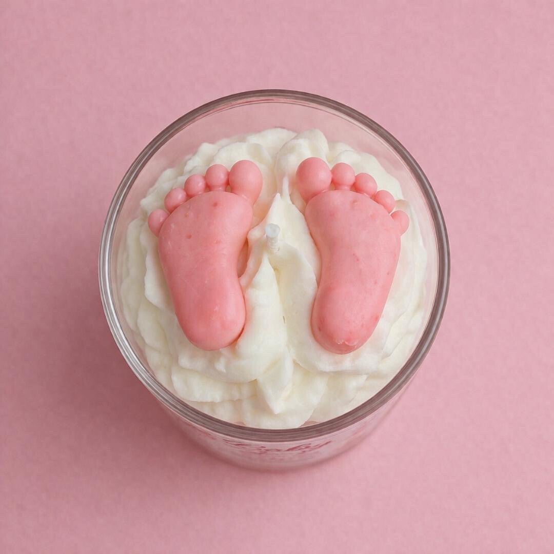 De kaars heeft een zachte roze basis en is afgewerkt met witte whipped wax en kleine babyvoetjes als detail. Een lief en subtiel decoratief item voor een bijzondere gelegenheid.